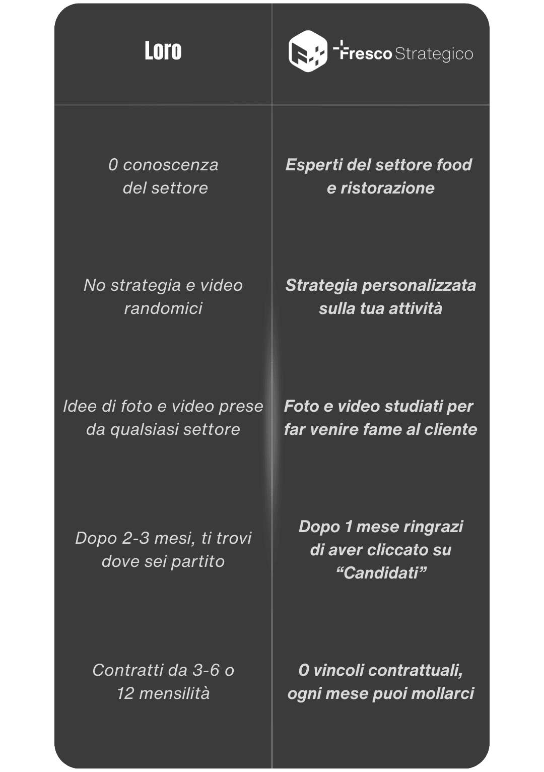 Se non lo hai capito fino ad ora, NON ESISTONO COMPETITOR. Se hai un'attività food a ROMA, dovresti aver già capito a chi devi affidare la comunicazione del tuo locale. Solo 2 parole: FRESCO, STRATEGICO.